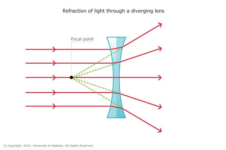 Concave lens: The rays bend outwards (diverge). The rays appear to spread out from one point, situated in front of the lens.
