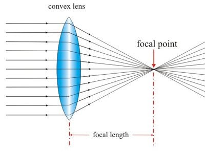 Convex lens: The rays bend inwards (converge) towards the principal axis and meet at the focal point.